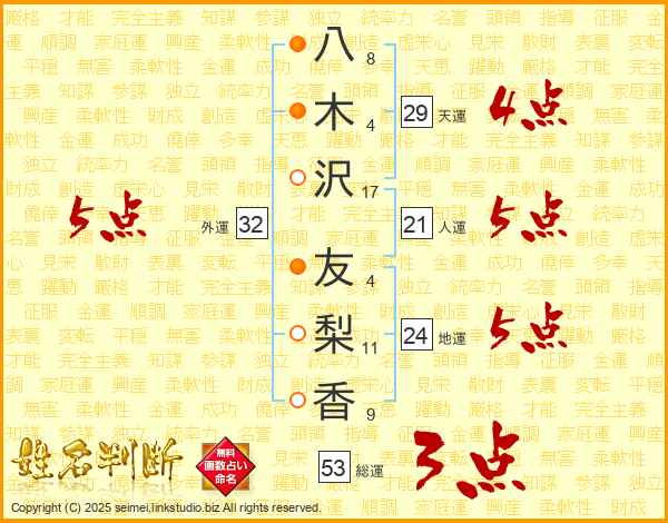 八(8画)木(4画)沢(17画) 友(4画)梨(11画)香(9画)