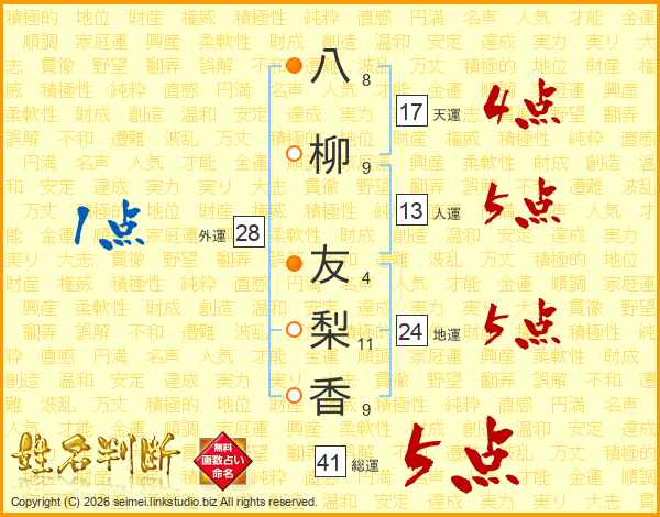 八(8画)柳(9画) 友(4画)梨(11画)香(9画)