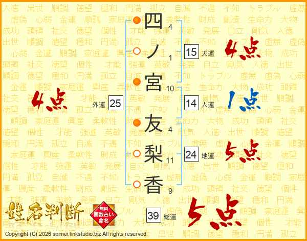 四(4画)ノ(1画)宮(10画) 友(4画)梨(11画)香(9画)