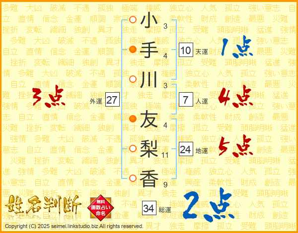 小(3画)手(4画)川(3画) 友(4画)梨(11画)香(9画)