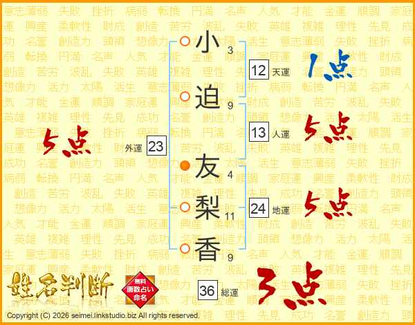 小(3画)迫(9画) 友(4画)梨(11画)香(9画)