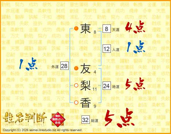 生活面を象徴する運勢です。外部から受ける影響力を表し、結婚運、家庭運や職場、環境への順応性を表します。総運から人運を引いた画数。姓や名が1文字の場合を除く。