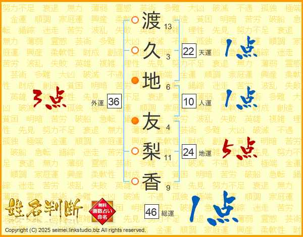 渡(13画)久(3画)地(6画) 友(4画)梨(11画)香(9画)