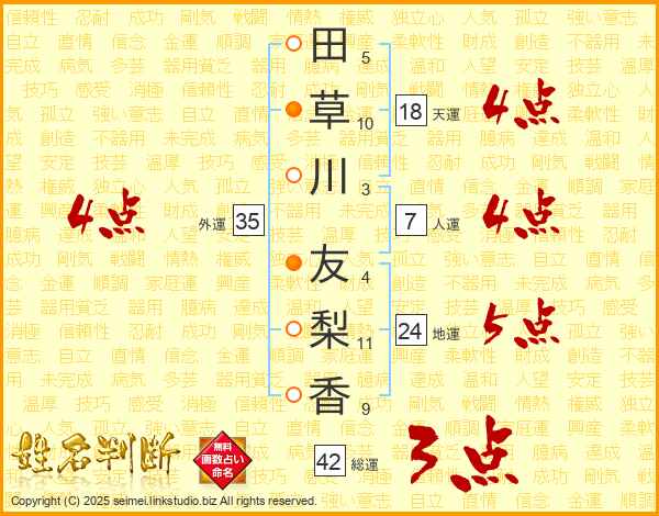 田(5画)草(10画)川(3画) 友(4画)梨(11画)香(9画)