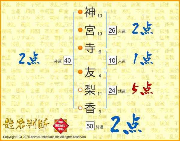 神(10画)宮(10画)寺(6画) 友(4画)梨(11画)香(9画)