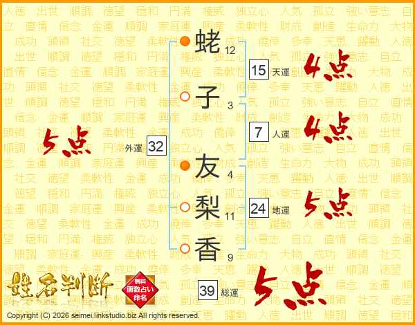 蛯子友梨香さんの総運は39画の5点!