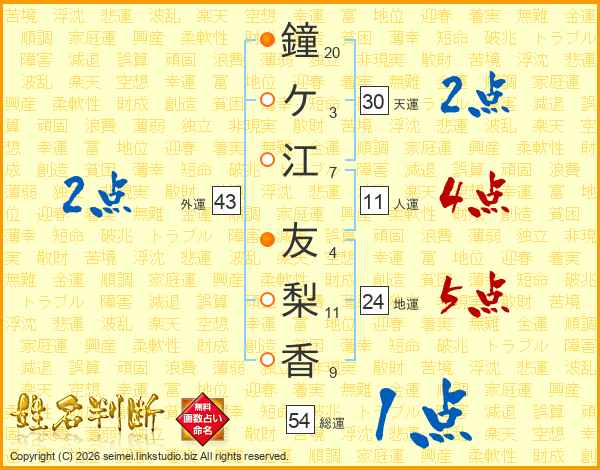 鐘(20画)ケ(3画)江(7画) 友(4画)梨(11画)香(9画)
