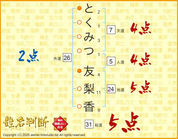 と(2画)く(1画)み(3画)つ(1画) 友(4画)梨(11画)香(9画)