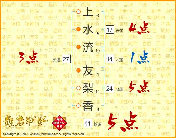上(3画)水(4画)流(10画) 友(4画)梨(11画)香(9画)