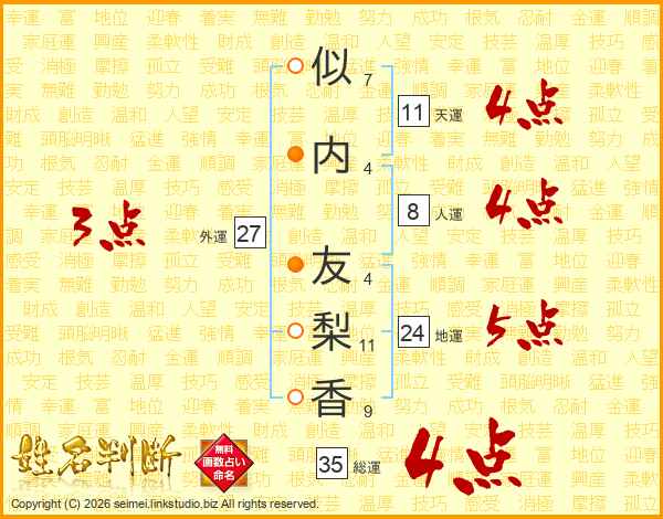 似(7画)内(4画) 友(4画)梨(11画)香(9画)