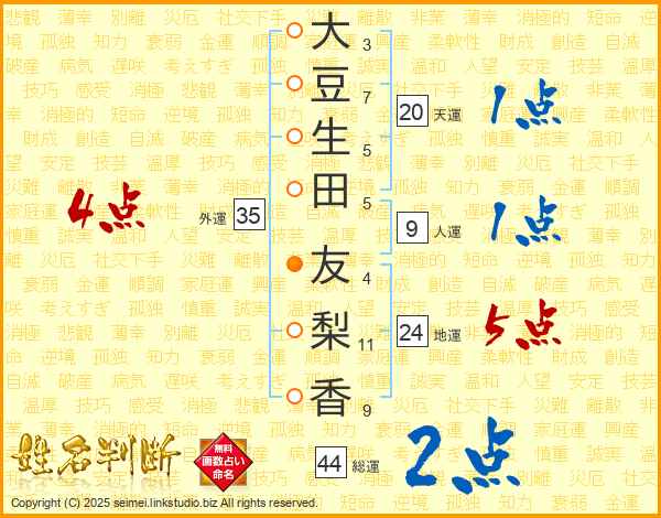 大(3画)豆(7画)生(5画)田(5画) 友(4画)梨(11画)香(9画)