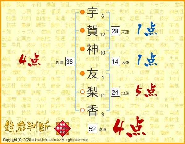 宇(6画)賀(12画)神(10画) 友(4画)梨(11画)香(9画)