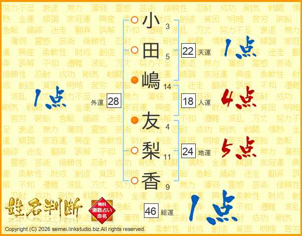小(3画)田(5画)嶋(14画) 友(4画)梨(11画)香(9画)