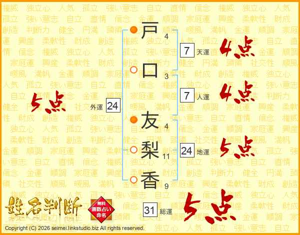 戸(4画)口(3画) 友(4画)梨(11画)香(9画)