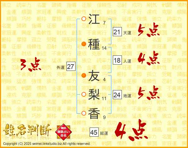 江(7画)種(14画) 友(4画)梨(11画)香(9画)