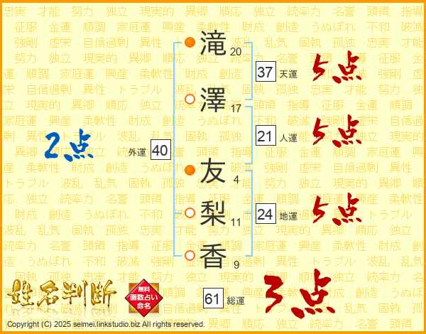 滝(20画)澤(17画) 友(4画)梨(11画)香(9画)