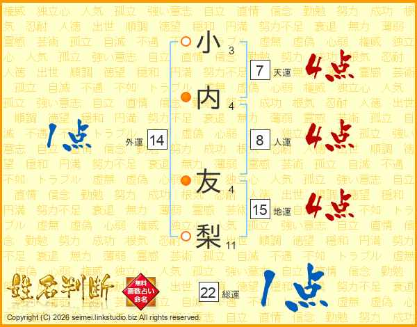 生活面を象徴する運勢です。外部から受ける影響力を表し、結婚運、家庭運や職場、環境への順応性を表します。総運から人運を引いた画数。姓や名が1文字の場合を除く。