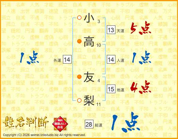 生活面を象徴する運勢です。外部から受ける影響力を表し、結婚運、家庭運や職場、環境への順応性を表します。総運から人運を引いた画数。姓や名が1文字の場合を除く。