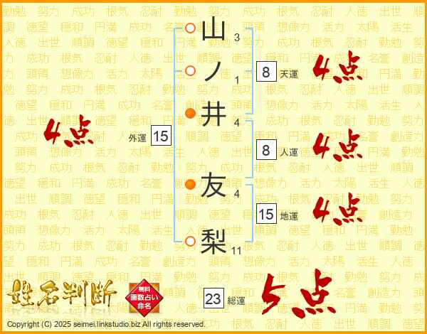 山ノ井友梨さんの外運は15画の4点!