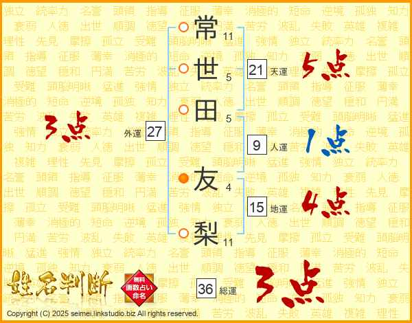 常(11画)世(5画)田(5画) 友(4画)梨(11画)