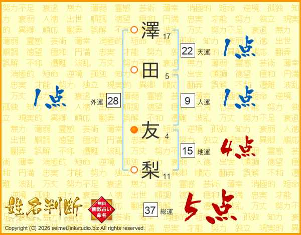 澤(17画)田(5画) 友(4画)梨(11画)