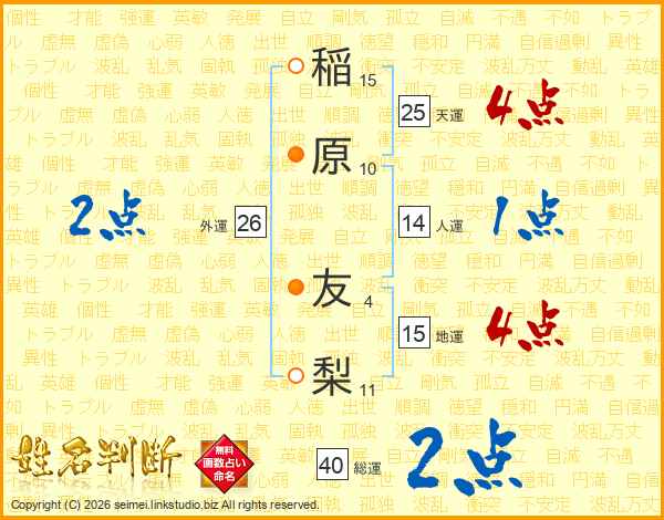 稲(15画)原(10画) 友(4画)梨(11画)