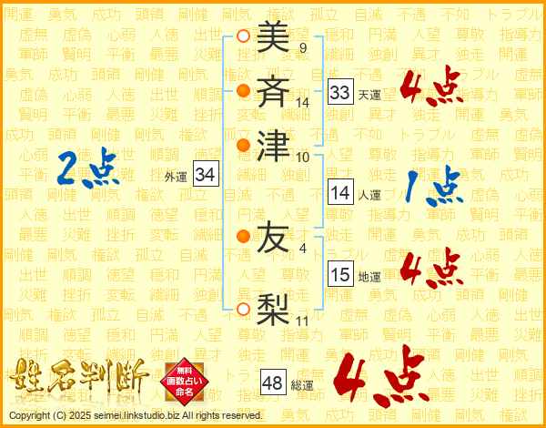 美(9画)斉(14画)津(10画) 友(4画)梨(11画)
