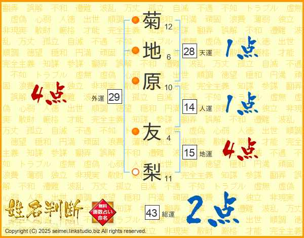 菊地原友梨さんの総運は43画の2点!