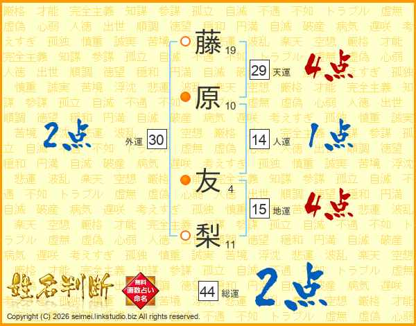 生活面を象徴する運勢です。外部から受ける影響力を表し、結婚運、家庭運や職場、環境への順応性を表します。総運から人運を引いた画数。姓や名が1文字の場合を除く。