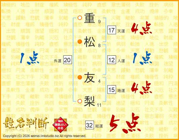 重(9画)松(8画) 友(4画)梨(11画)