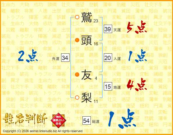 鷲(23画)頭(16画) 友(4画)梨(11画)