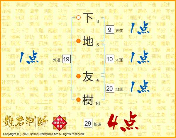 生活面を象徴する運勢です。外部から受ける影響力を表し、結婚運、家庭運や職場、環境への順応性を表します。総運から人運を引いた画数。姓や名が1文字の場合を除く。