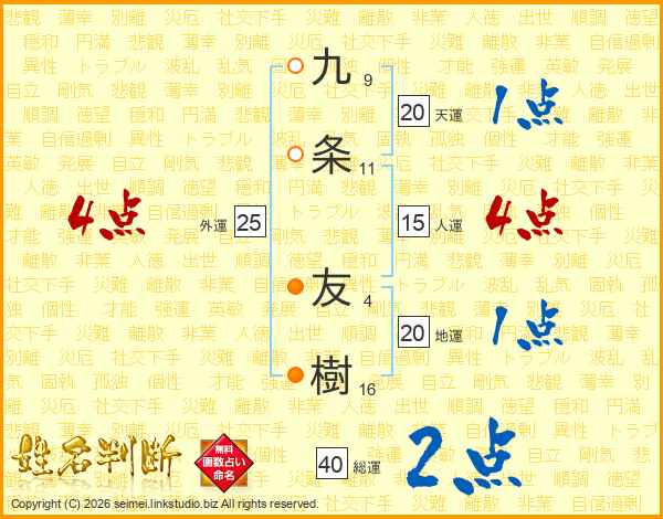 あなたの人生を表す1番重要な運勢です。生涯を通じて影響する総合運となり、主に50歳以降の晩年期に影響を及ぼします。苗字と名前の合計画数。
