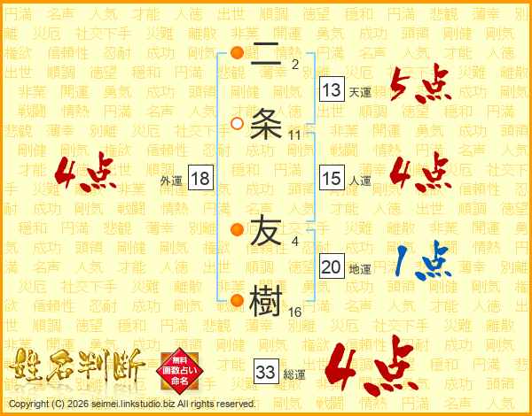 二条友樹さんの総運は33画の4点!