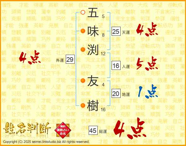 五(5画)味(8画)渕(12画) 友(4画)樹(16画)