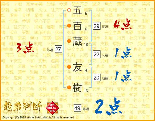 五(5画)百(6画)蔵(18画) 友(4画)樹(16画)
