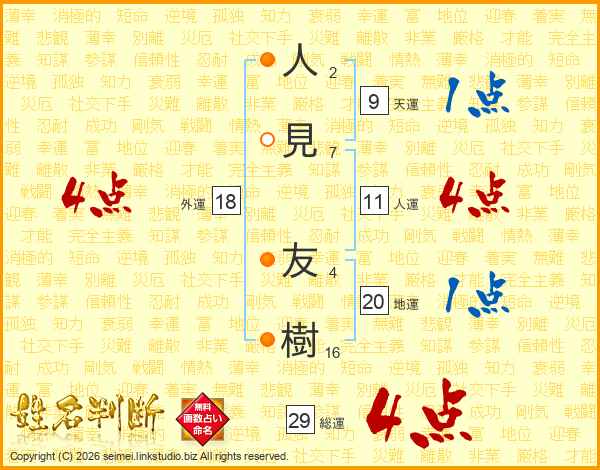 生活面を象徴する運勢です。外部から受ける影響力を表し、結婚運、家庭運や職場、環境への順応性を表します。総運から人運を引いた画数。姓や名が1文字の場合を除く。