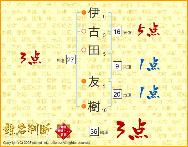 伊(6画)古(5画)田(5画) 友(4画)樹(16画)