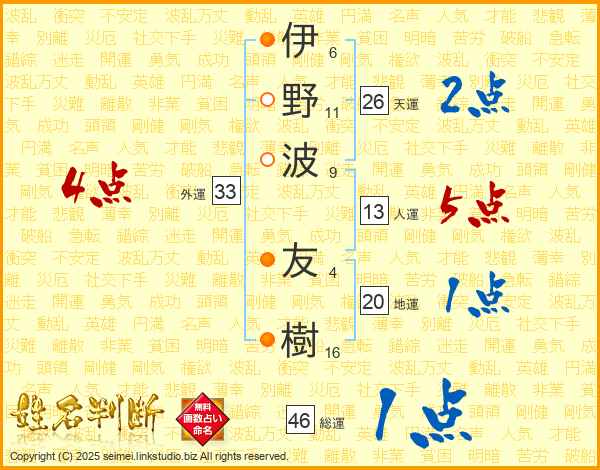 伊野波友樹さんの天運は26画の2点!