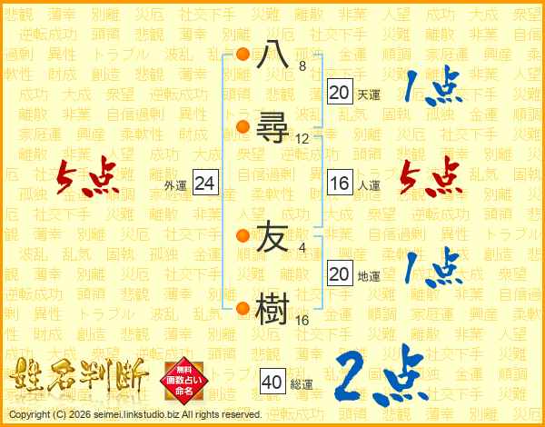 あなたの人生を表す1番重要な運勢です。生涯を通じて影響する総合運となり、主に50歳以降の晩年期に影響を及ぼします。苗字と名前の合計画数。