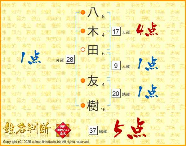 八(8画)木(4画)田(5画) 友(4画)樹(16画)
