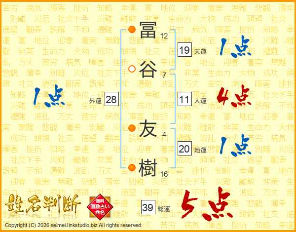 冨谷友樹さんの総運は39画の5点!