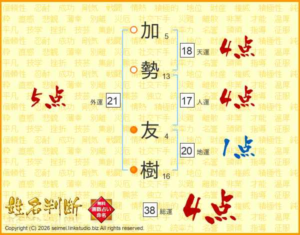 生活面を象徴する運勢です。外部から受ける影響力を表し、結婚運、家庭運や職場、環境への順応性を表します。総運から人運を引いた画数。姓や名が1文字の場合を除く。