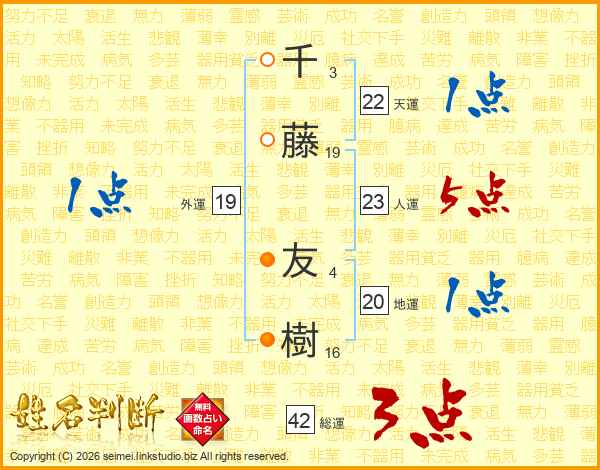 千(3画)藤(19画) 友(4画)樹(16画)