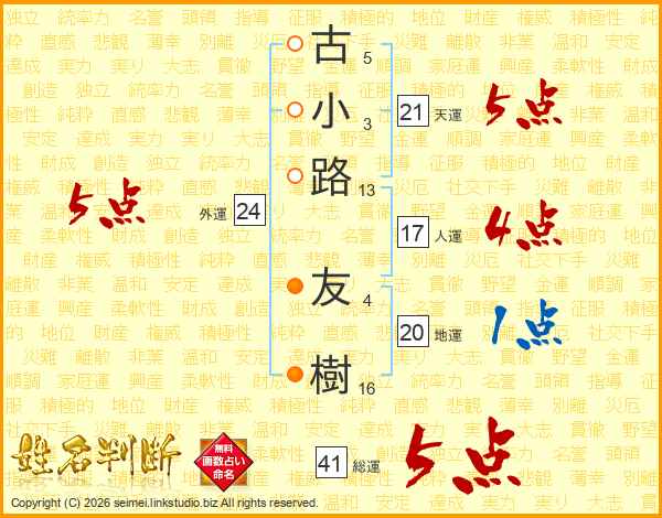 古(5画)小(3画)路(13画) 友(4画)樹(16画)