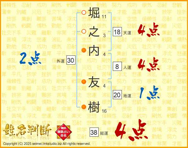 堀之内友樹さんの総運は38画の4点!