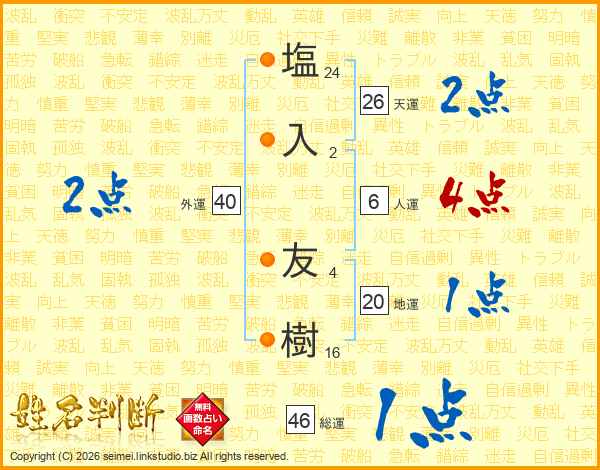 塩(24画)入(2画) 友(4画)樹(16画)