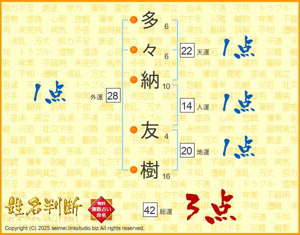 多(6画)々(6画)納(10画) 友(4画)樹(16画)