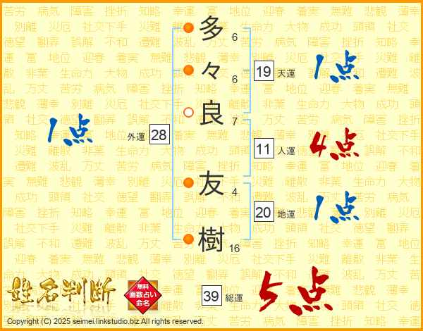 多々良友樹さんの総運は39画の5点!