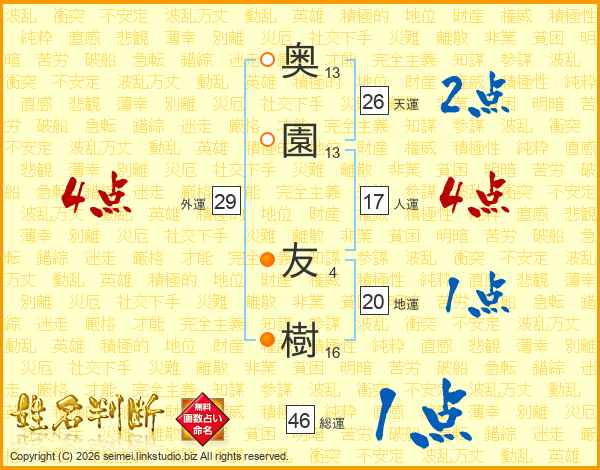 生活面を象徴する運勢です。外部から受ける影響力を表し、結婚運、家庭運や職場、環境への順応性を表します。総運から人運を引いた画数。姓や名が1文字の場合を除く。